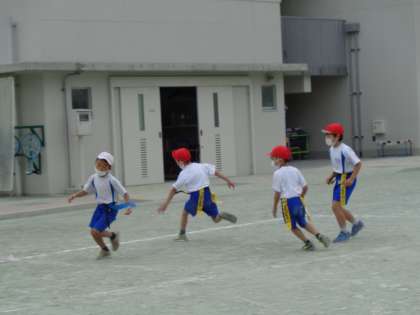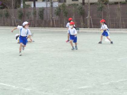 今日は、「タグとりおに」をしました。腰にタグを着けて、相手に捕られたら、10秒コートの外でお休みです。捕られないように相手を「かわす」動きを身に付けていきます。楽しみながら、右へ左へと俊敏にたくさん動いていました。
