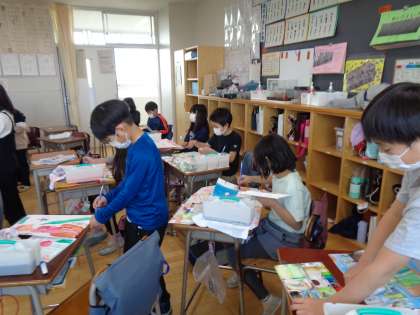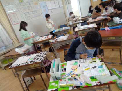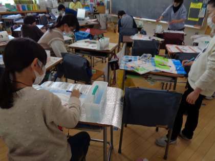 自分の将来の夢をえがいて、絵の具で色をつけています。細かく丁寧で、夢への思いが伝わってきました。