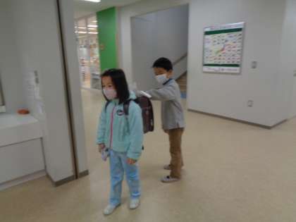1年生どうしでランドセルを拭き合う姿が見られました。すてきですね。