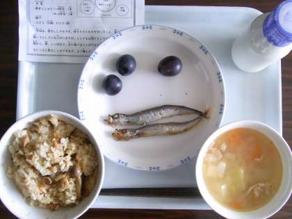 焼きししゃもは、結構よく出るメニュですが、ときどき骨をとって食べようとする児童がいます。できれば、焼きししゃもくらいは頭からかぶりついて、骨ごと食べられるようになってほしいです。よく噛むということと、カルシウムをとるという、二つの良い点があります。ちなみに、私はアジの干物もそうやって食べますよ!