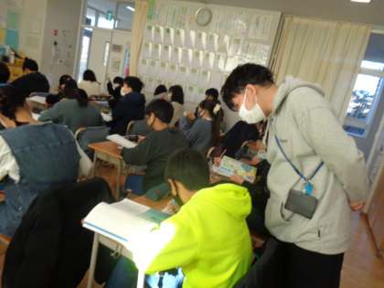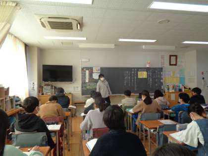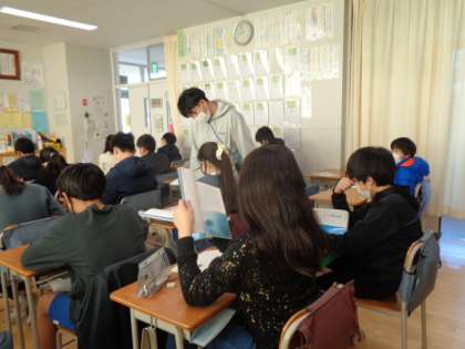 クラスみんなで、「太一」のとった行動の意味を考えていました。友達の考えを聞いて、さらに自分の考えを深めながら、「人間と自然との共生」や「人間の成長」という物語の主題にせまっていきました。一人一人がよく考えていて、教室は静かな緊張感がありました。