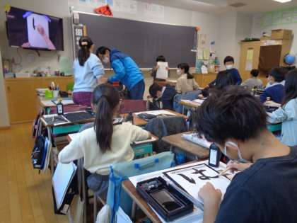 筆の持ち方、姿勢などどの子も身に付いています。テレビ画面にはお手本の動画が流れていて、筆の運び方などを見ながら書いていました。