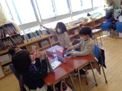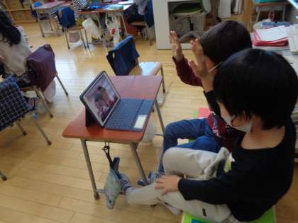 楽しみにしていた問題を出し合う授業です。考えたヒントが上手で、分かりそうで分からないのがとても楽しいようでした。リモートの子たちとも問題を出し合うことができ、画面越しでも嬉しそうでした。