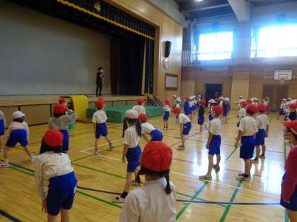 今日は、3クラス合同で行いました。人数が多くても、よく話を聞いてしっかりと行動できるのでとても落ち着いていました。もうすぐ2年生らしい立派な姿です。