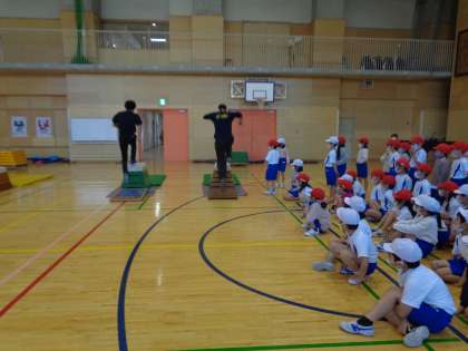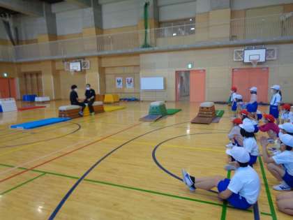 初めて「跳び箱ランド」を行うクラスもあったので、最初に跳び方の話を聞きました。先生達がおもしろく説明するので、大笑いしていました。早くやりたくてうずうずしていました。