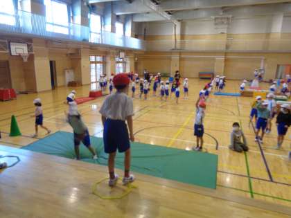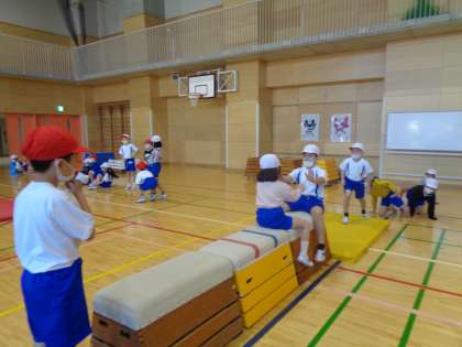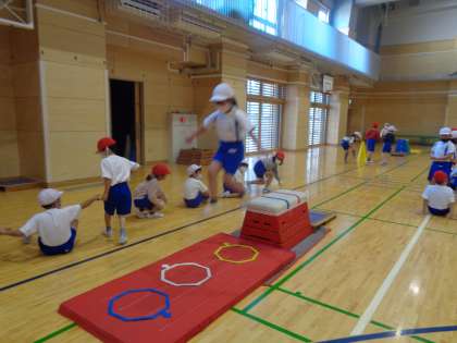 高く跳んだり、力強く踏み切ったり、手で体を支えたり、跳び箱の基本の動きを遊びながら身に付けています。次に人へ「はい、どうぞ!」の約束を守って安全に楽しく行っていました。