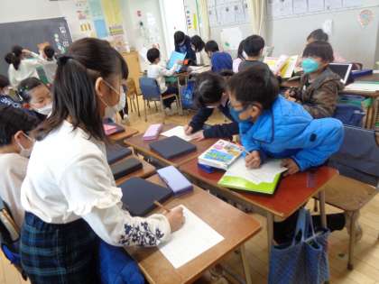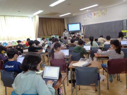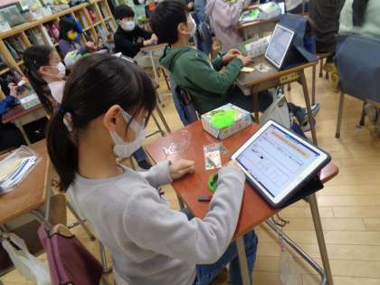 3年生が磁石の働きについて調べていました。自分でいろいろ試しながら、分かったことをロイロノートに打ち込んでいました。