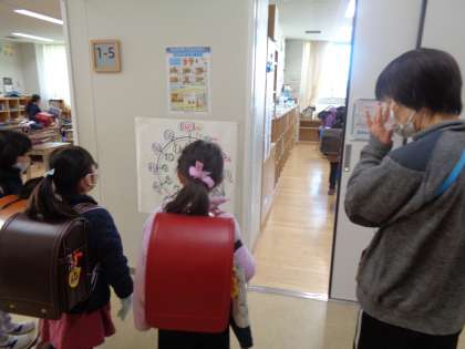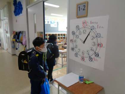 1年生の教室のドアの横に大きな時計が貼ってあります。