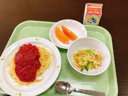 今日は、トマトソーススパゲッティ、ポテトチップスサラダ、せとか、牛乳です。