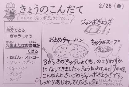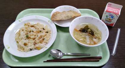 今日のメニューはお豆チャーハン、ジャンボ餃子、中華スープ、牛乳です。