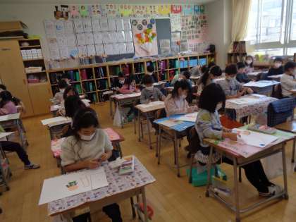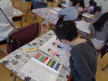 絵を描くまとめとしても今まで学習してきたことを生かして仕上げました。クレパスでしっかりと塗り、のびのびと表現していて成長が感じられました。