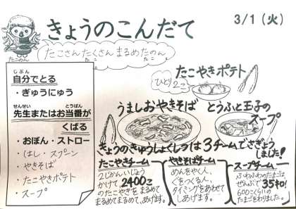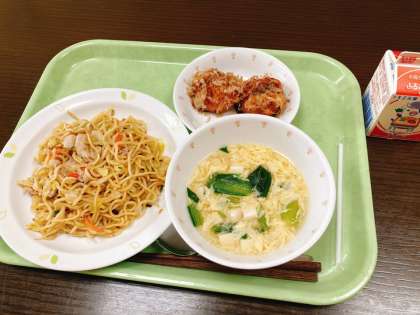 今日は、うま塩焼きそば、たこ焼きポテト、豆腐と玉子のスープ、牛乳です。