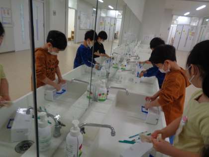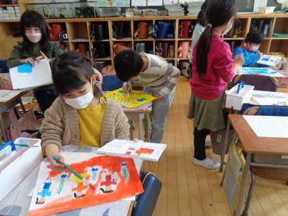 1年生がクレパスで描いた「1年間の思い出の絵」の背景に絵の具で色を塗っていました。この1年間で筆の遣い方や水の調整の仕方がしっかり身に付いて、すてきに仕上げていました。片付けもとても上手でした。