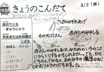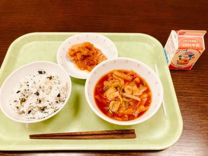 今日は、わかめごはん、鯖のみぞれ揚げ、赤だしのみそ汁、牛乳です。