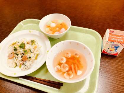 今日は、菜の花ピラフ、手まりのスープ、フルーツ白玉、牛乳です。