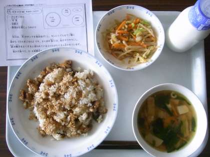 さんまごはん・牛乳・吉野汁・野菜の生姜じょうゆかけ