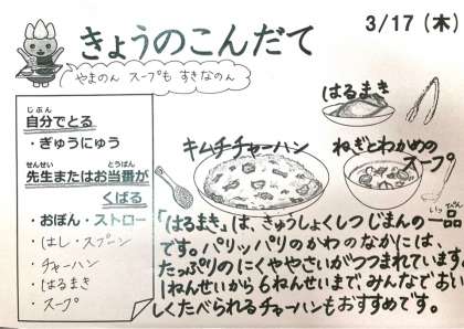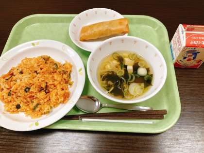 今日は、キムチチャーハン、春巻、ねぎとわかめのスープ、牛乳です。