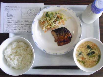 今日:ごはん・牛乳・鯖の七味焼き・野菜のごま酢かけ・かきたま汁