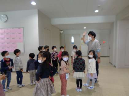 先生が「にんじゃの歩き方・・・」と言うと子供たちは静かにそーっと忍び足をしていました。このようにして、学校の約束や場所などを少しずつ覚えていきます。