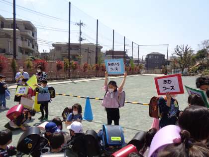 先頭の子がコースの表示をもっているので、自分のコースに並びます。担当の先生が一人一人、名前を確認します。そして、1年生全員の確認がとれたら、コースごとに出発します。