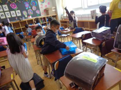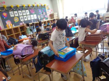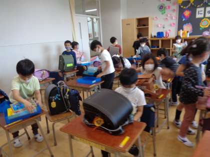 ランドセルを自分のロッカーから持ってきて、教科書やノートを入れていました。すっかり手順を覚えて、みんな一人で出来ています。少しずつ少しずつ自分で出来ることが増えていっています