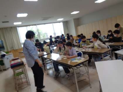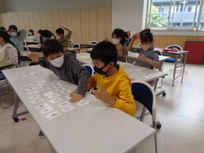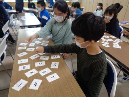 名前のつづりを書けるようにするために、アルファベットを覚えていました。まずは、カードを見て、友達と教え合いました。その後、カルタのように先生が言ったアルファベットを取ります。楽しみながら1文字1文字覚えていました。