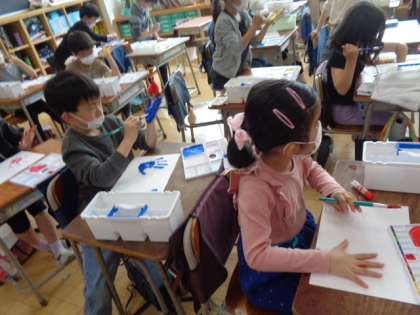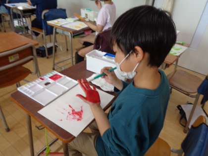 まず、好きな色の絵の具で手形をとりました。筆で自分の手に絵の具を塗るのは、不思議な気持ちのようで、それぞれの感想を思わず声に出していました。