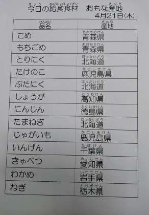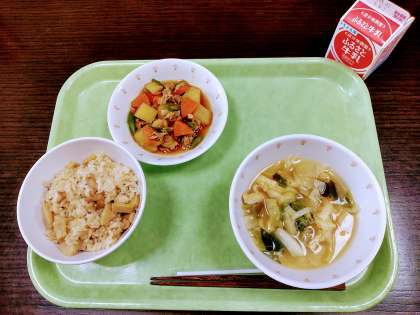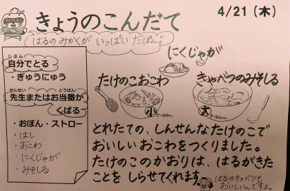 今日は、たけのこおこわ、肉じゃが、きゃべつのみそ汁、牛乳です。