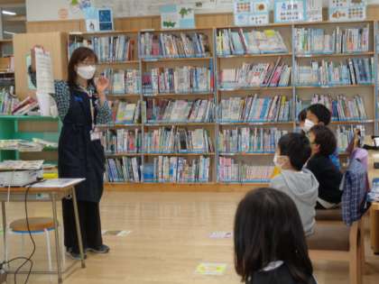 図書の時間が始まる前にオリエンテーションを行っています。司書の先生に図書室の使い方や約束を教えていただきます。図書室は、地域にある図書館と同じで、公共の場です。みんなで使うということを改めて確認しました。