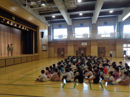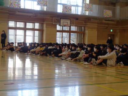 1年生全員が体育館に入場しました。ピンと姿勢よく座り、立派な姿です。