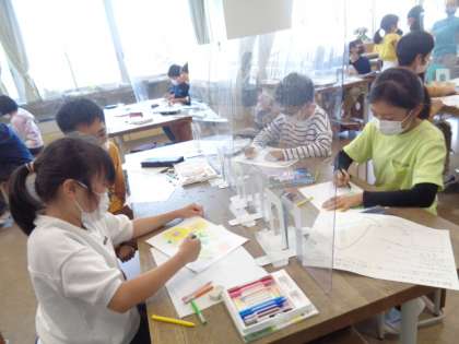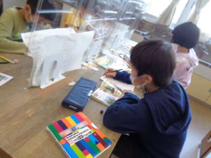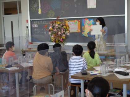 「季節を感じて」という題材です。めあては「贈りたい人に向けた花を画用紙いっぱいに描こう」です。相手を思い浮かべながら、きれいな花を描いていました。図鑑や本物の花を見て、細かくていねいに描いていました。
