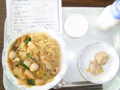 五目焼きそば・牛乳・コーン団子・杏仁豆腐