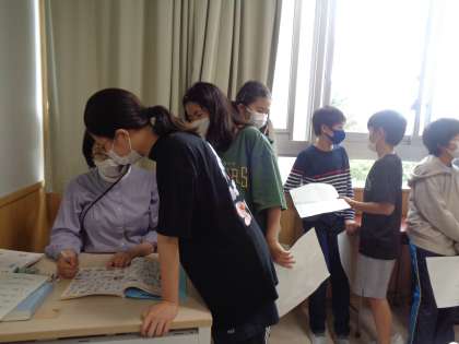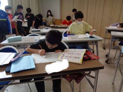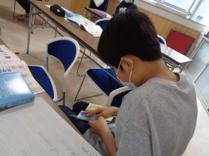 自己紹介の準備をしていました。自分で書きあげて、先生に見てもらっていました。辞書で調べたり、集中して書いていたりと、発表に向けて頑張っていました。