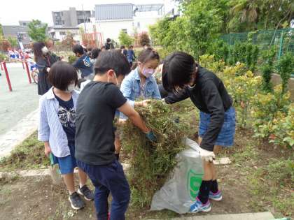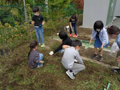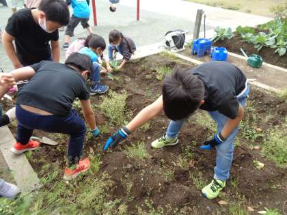 雑草を抜き、土をスコップで掘り返しました。各クラスの野菜リーダーを中心としたボランティア活動です。畑はあっという間にきれいになりました。それでも、野菜リーダーたちは、「もっともっと土をやわらかくした方がいい。」とやる気いっぱいです。