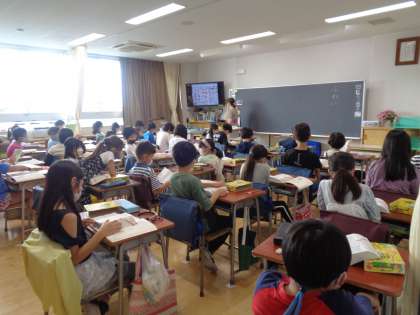 辞書の使い方を学んでいました。テレビ画面で映しながら、調べたい言葉の探し方を確認していました。先生の説明がとても分かりやすいので、どの子も上手に辞書を使いこなしていました。