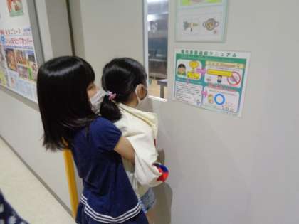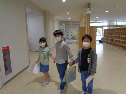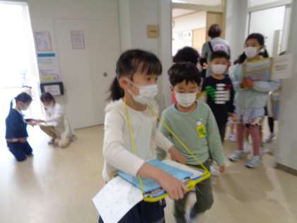 今日は2年生が、お兄さん、お姉さんとなり、1年生を学校探検(学校案内)に連れて歩きました。