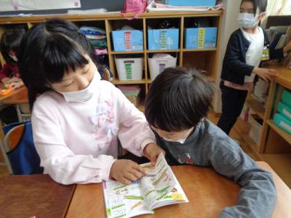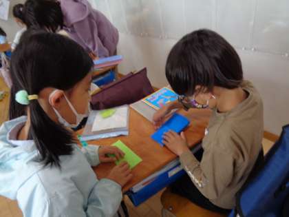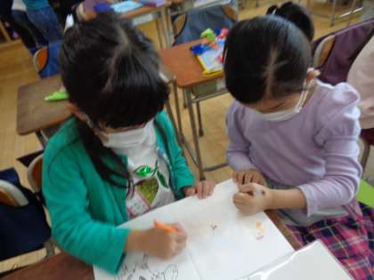 学校探検が終わって、教室で一緒に遊びました。折り紙やお絵かきなど2年生が考えてきた遊びをしました。もっと仲良くなりました。