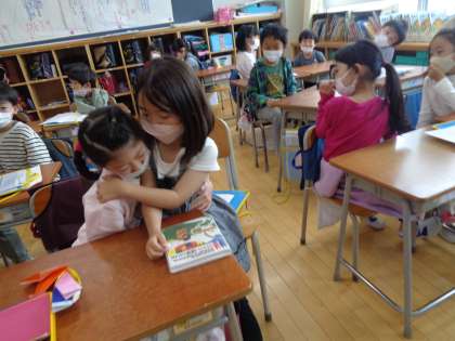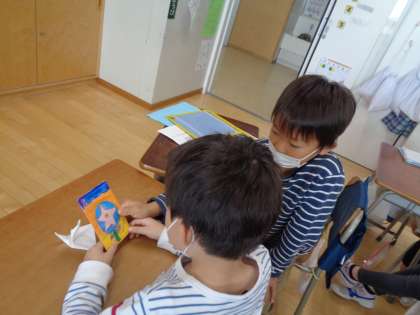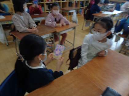 最後に、2年生からあさがおのたねのプレゼントです。2年生が1年生のときに育てたあさがおのたねです。1年生は、これから育てるのですね。きっときれいなあさがおの花が咲きますよ。