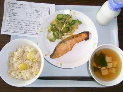 献立メモより:秋の味覚といわれる栗は、日本では今から1万年以上も前の、縄文時代から食べられている長い歴史をもつ食べ物です。また、栗には食べた物をエネルギーに変えるビタミンB1、B2、菌やウィルスから体を守るビタミンC、余分な塩分を体の外に出すカリウム、など様々な栄養がぎっしり詰まっています。