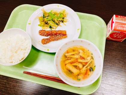 今日は、ごはん、イカのかりんとう揚げ、野菜のからしあえ、かしわ汁、牛乳です。
