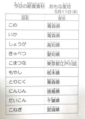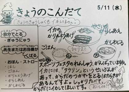 かりんとう揚げ、からしあえ、かしわ汁、今日は「か」で始まるメニューです。イカにはタウリンという成分が含まれています。栄養ドリンクに入っているやつですね。疲労回復だけでなく、コレステロールの吸収を抑える作用もあるそうです。