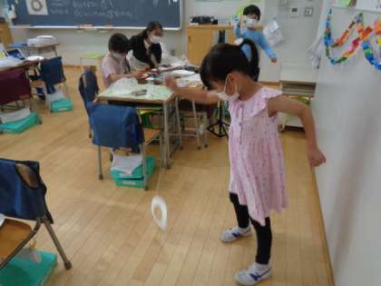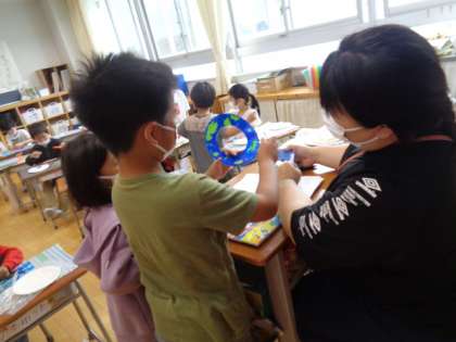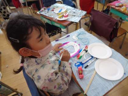 紙皿と割り箸とひもでけん玉を作りました。紙皿を何に見立てるかを考えました。犬やクマやクラゲなど個性豊かなけん玉ができました。穴のところの形を変えて工夫していました。できたら、友達と遊ぶのもとても楽しそうでした。