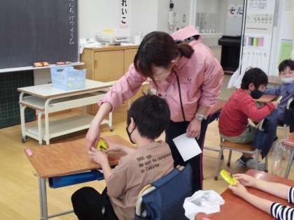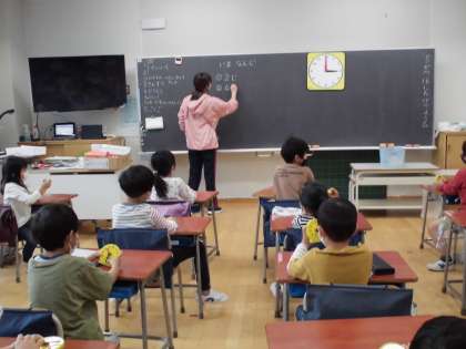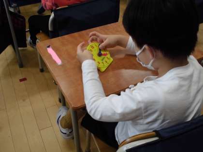 先生が、「4じはん」と言うと、子供たちは、時計の針を合わせます。模型の時計で実際に動かすことで、時計の針の動きを確かめながら理解することができます。1年生にとって、こうした「操作」がとても大切です。