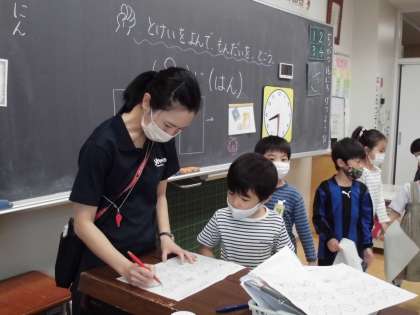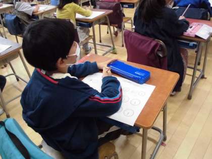 「とけい」のプリントに取り組んでいました。プリントができたら、先生に見てもらいます。列に並んで待っていることも授業での大切な約束です。簡単そうに見えますが、学習規律ができていないと静かに待つことは難しいです。