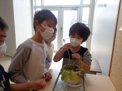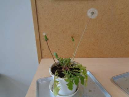 たんぽぽの様子が分かるように先生が、たんぽぽのわた毛をとってきて植木鉢に植えてくれました。教科書で説明されている通りになっていて、みんな興味津々に見ていました。