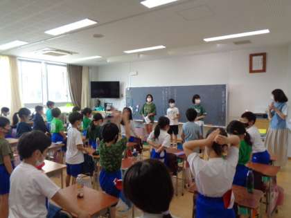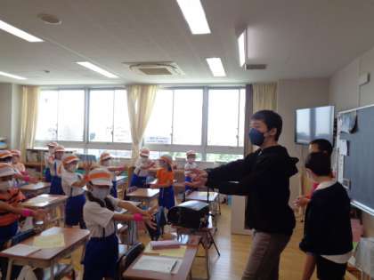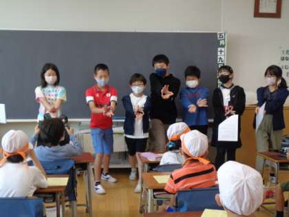 朝の時間を使って、各クラスに「決めポーズ」を教えにきてくれまいした。色ごとにポーズが違います。気合いの「決めポーズ」が各色でそろったら、かっこいいでしょうね。