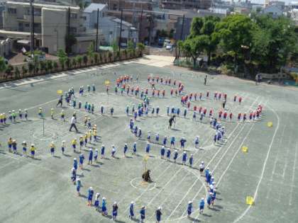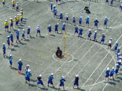 玉入れでは、音楽に合わせてダンスをします。フリフリととてもかわいいです。どのクラスがたくさん玉が入っているのかな?チームワークでがんばってくさいね。