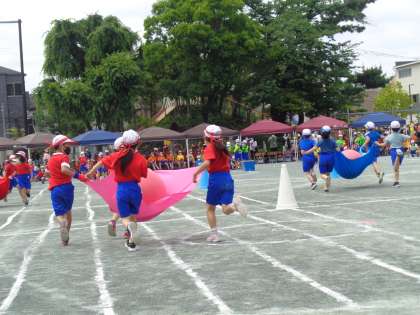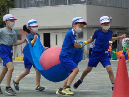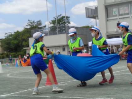 「気持ちを一つにおとさずはこぼう!ふわふわころりん」です。4人のバランスがとても大事です。まさに「気持ちを一つに!」です。どのチームも最後までがんばりました!!