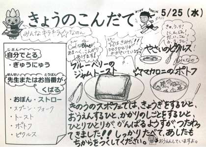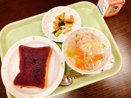 今日は、ブルーベリーのジャムトースト、米粉マカロニ入ポトフ、カラフルピクルス、牛乳です。
