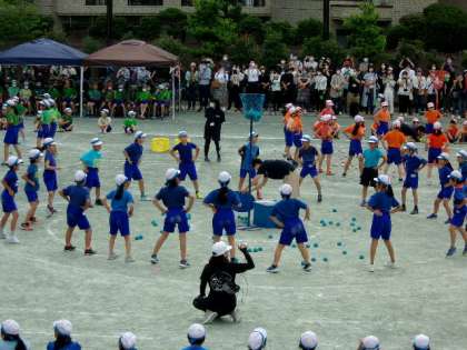 最初の競技は「U・S・A 2022」です。軽快な音楽にのって踊り、笛が鳴ったら玉入れスタート!